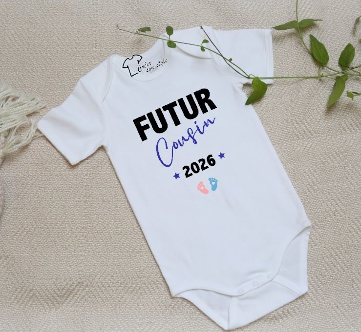 Body 100% coton disponible en couleur blanc avec écriture noir et bleu foncé. Les body sont disponible uniquement en blanc en manches courtes ou longues.