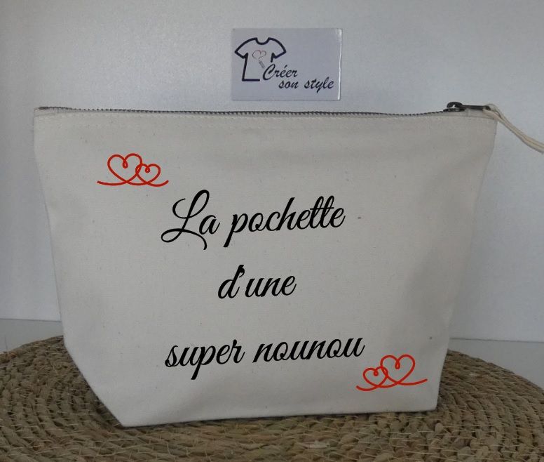 Pochette 100% coton, de couleur naturel avec écriture noir et dessin rouge.
