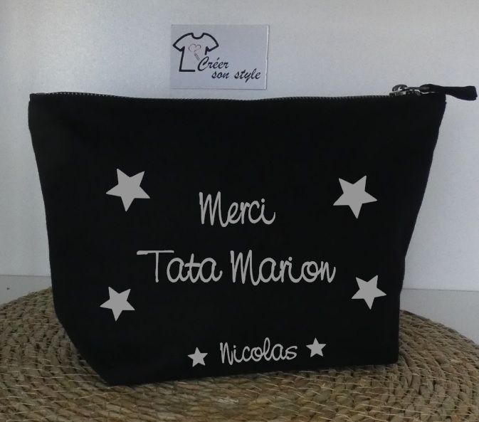 Fermeture par zippe en métal. Dimensions: 28 cm de large, 19 cm de haut. A personnalisé avec le mot de votre choix (marraine,mamie, maman,...) et prénoms de votre choix.