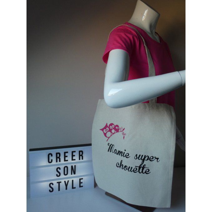 Sac shopping 100% coton avec poignée longue de couleur naturel avec écriture noir et fuchsia.
