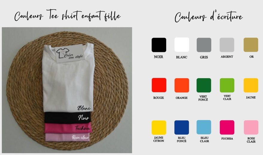 > Tee shirt enfant fille, 100% coton, disponible en noir, blanc, rose clair et fuchsia.